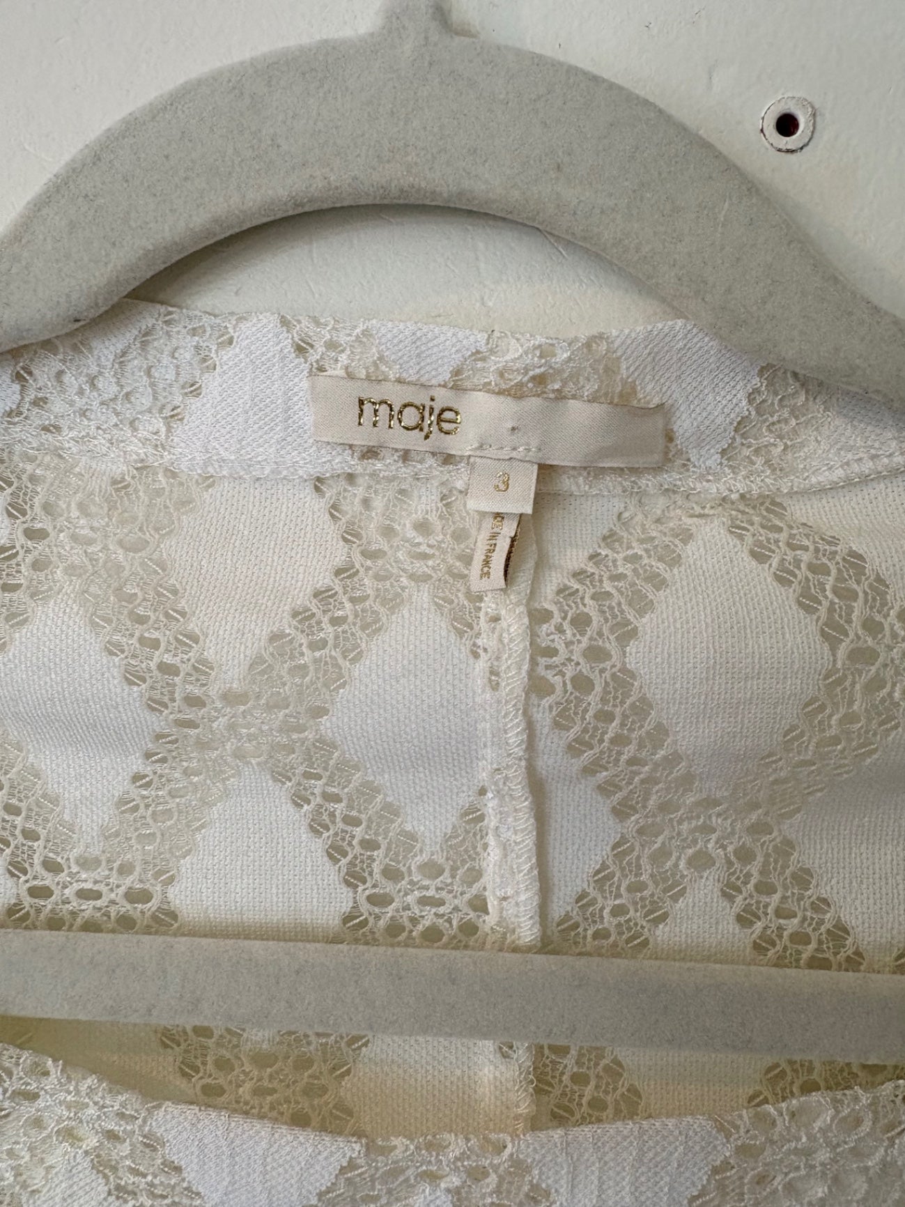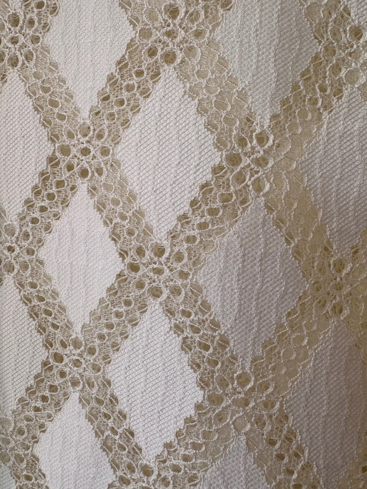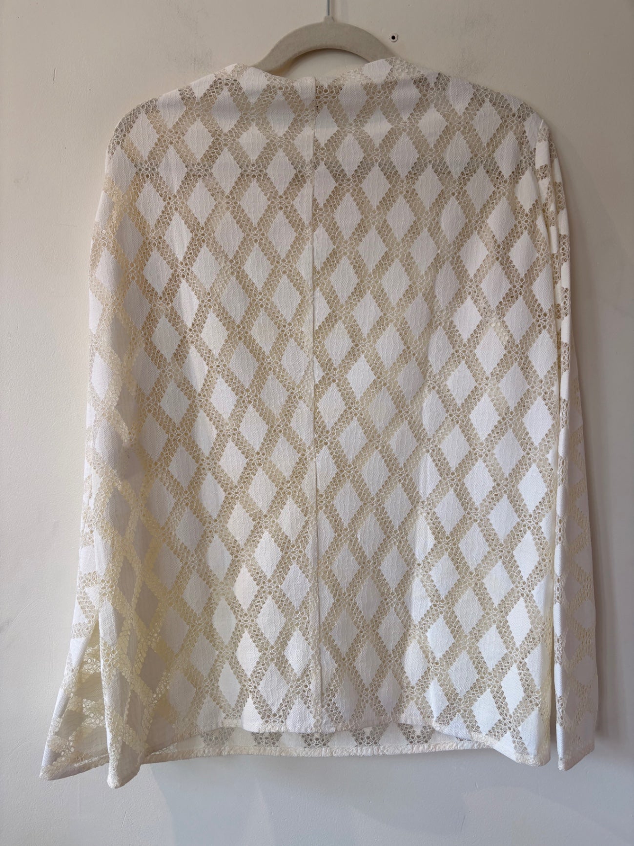 A delicate lace blouse featuring an intricate diamond pattern in cream and white. It offers a sophisticated and feminine silhouette, perfect for dressy occasions or elegant office wear. The lightweight fabric adds a touch of femininity and elegance to any outfit, making it a versatile wardrobe staple.