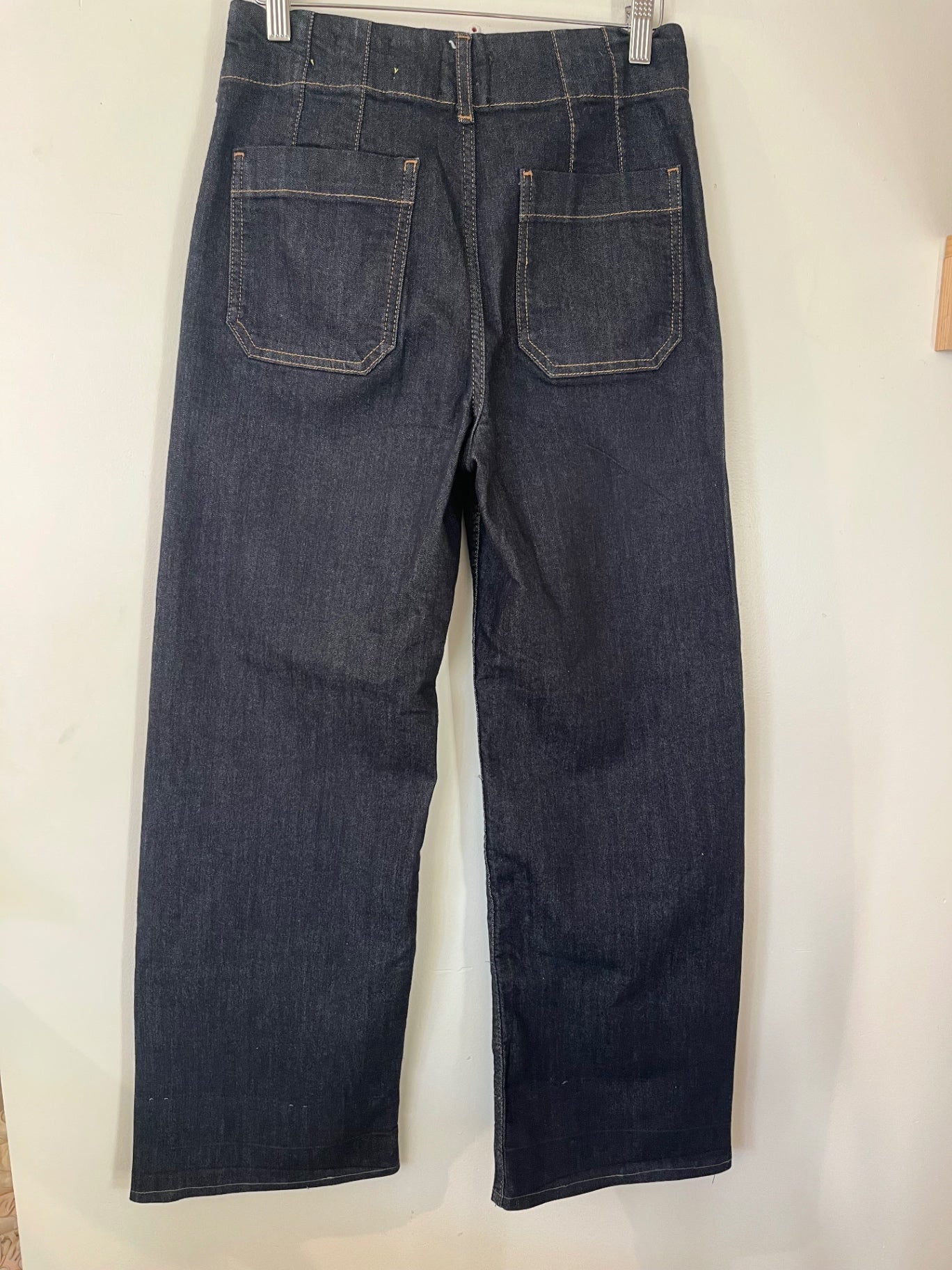 Classic dark blue denim jeans with a high-rise waist and straight-leg fit.