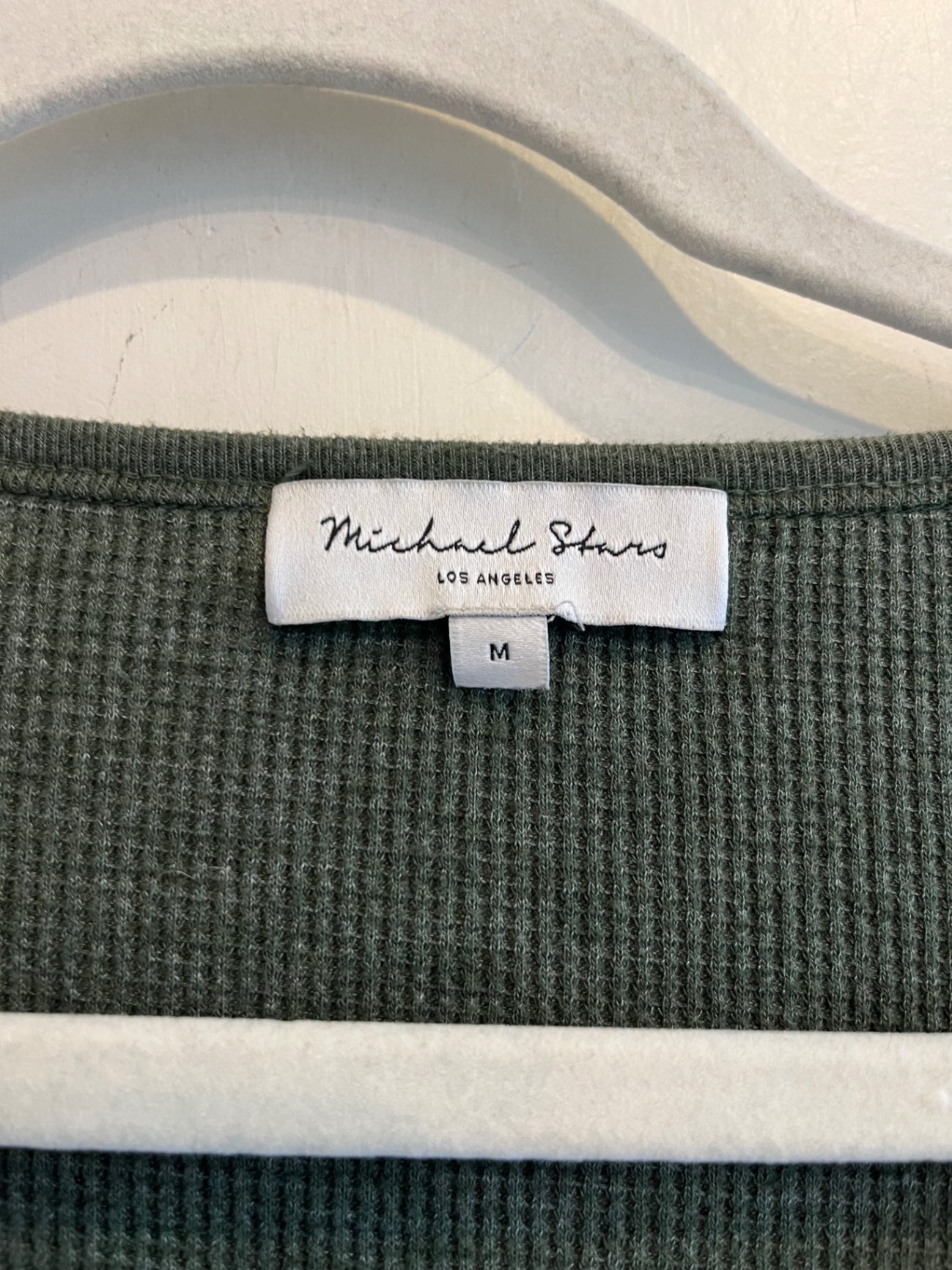 Soft waffle knit, stretchy, with henley buttons and slightly flared hem.