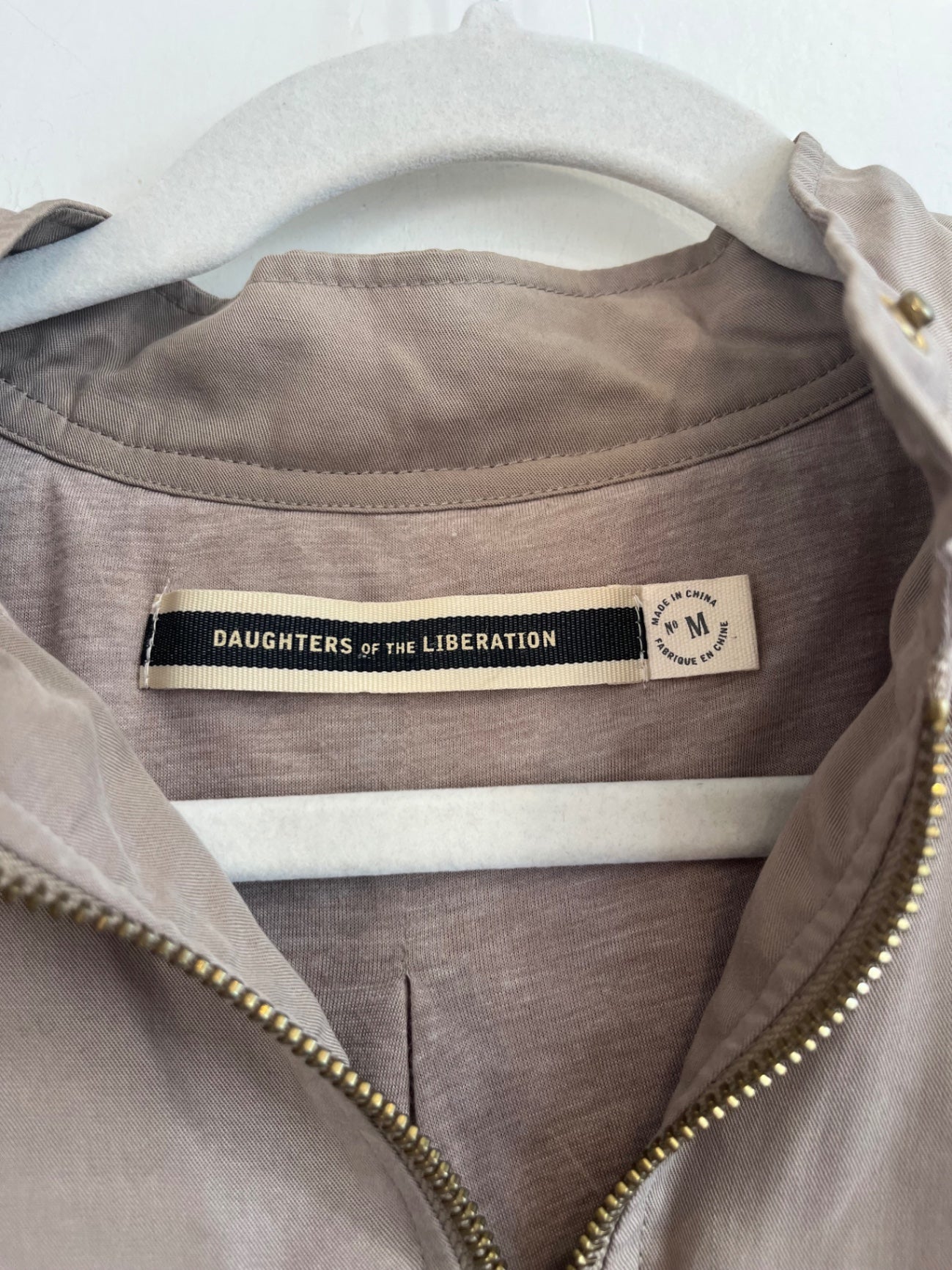 Taupe cropped jacket with gold hardware, pleated back detail, and soft ribbed cuffs.