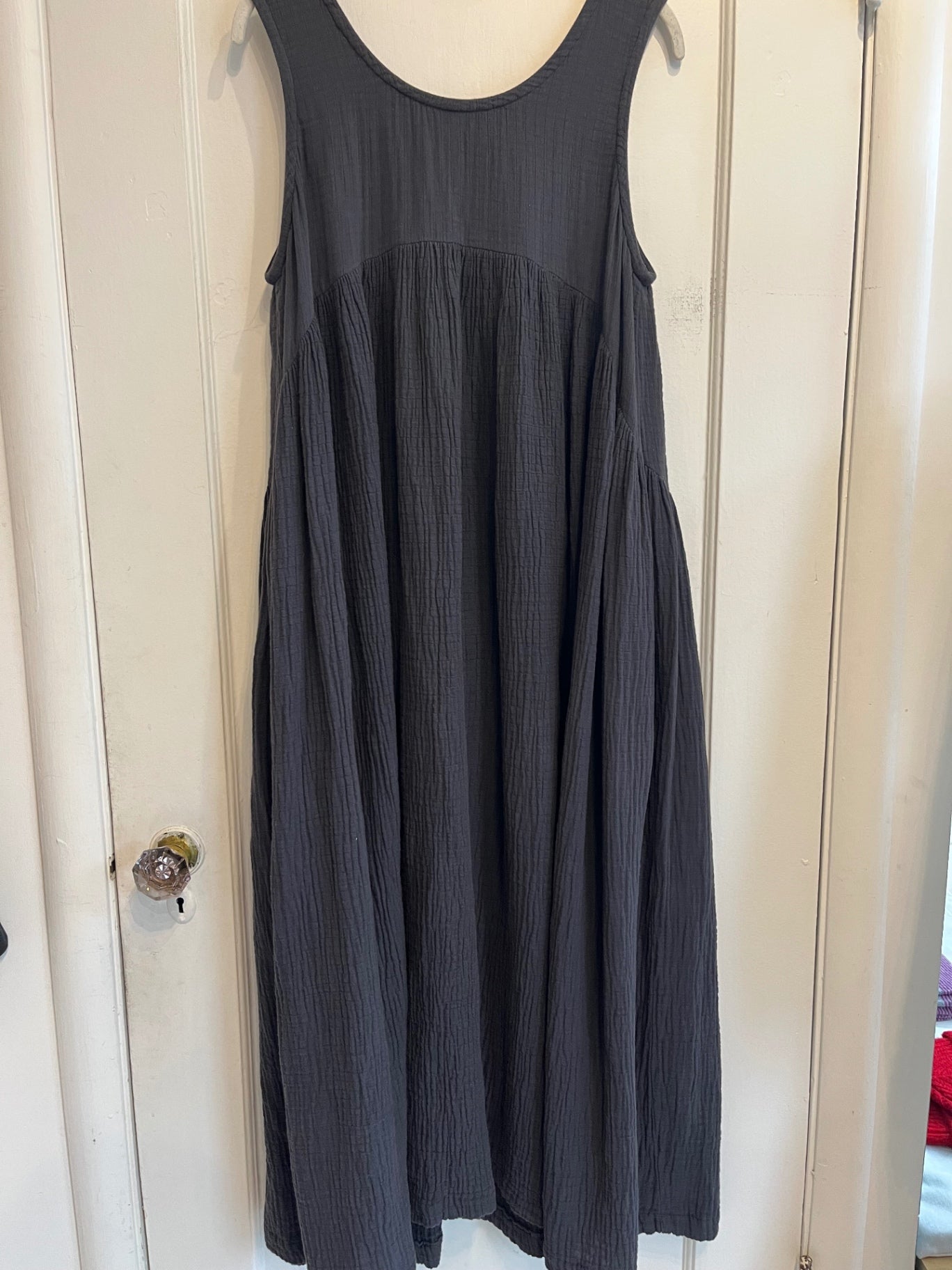 Flowy sleeveless maxi dress in lightweight cotton gauze with deep side pockets.