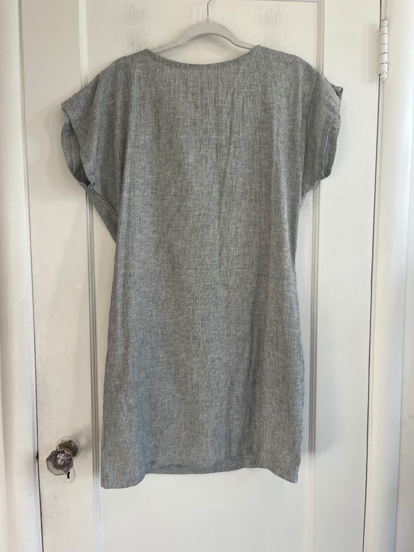Lightweight linen-blend dress with subtle pinstripe pattern. Relaxed fit with cap sleeves and minimal seaming.