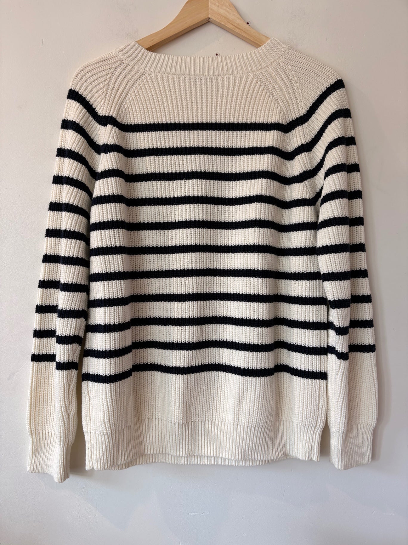 This cozy sweater from Amour Vert features a classic beige and black striped pattern, perfect for elevating your casual wardrobe. Its chunky knit texture offers warmth and comfort, ideal for chilly days. The relaxed fit and ribbed detailing at the cuffs and hem make it a versatile addition to your layering outfits. Timeless and stylish, it pairs well with jeans or skirts.