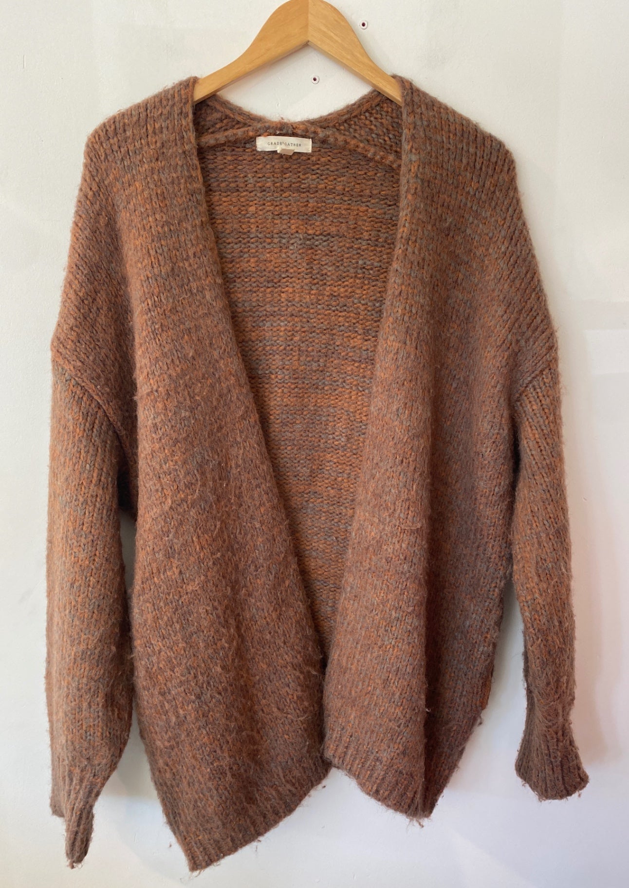 This cozy brown sweater features a textured knit pattern that adds warmth and style to any casual or layered look. Its relaxed fit and open front make it a versatile piece for chilly days. Perfect for pairing with jeans or skirts, this sweater brings comfort and a touch of effortless chic to your wardrobe.