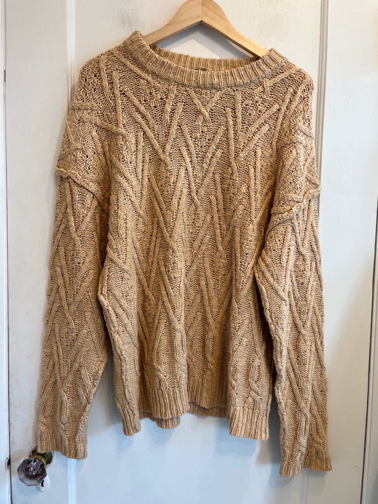 Chunky, textured knit with a wide neckline and slouchy, relaxed fit.