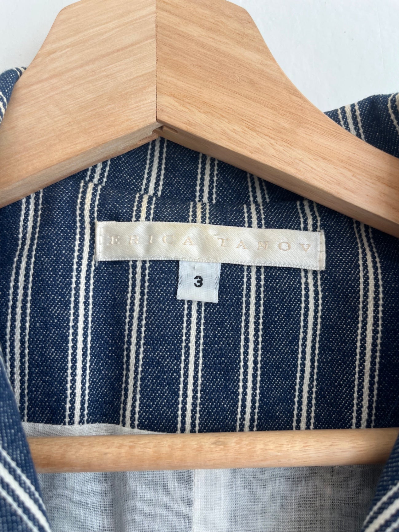 Navy and white striped linen-cotton blazer with a structured fit, notched lapel, and patch pockets.