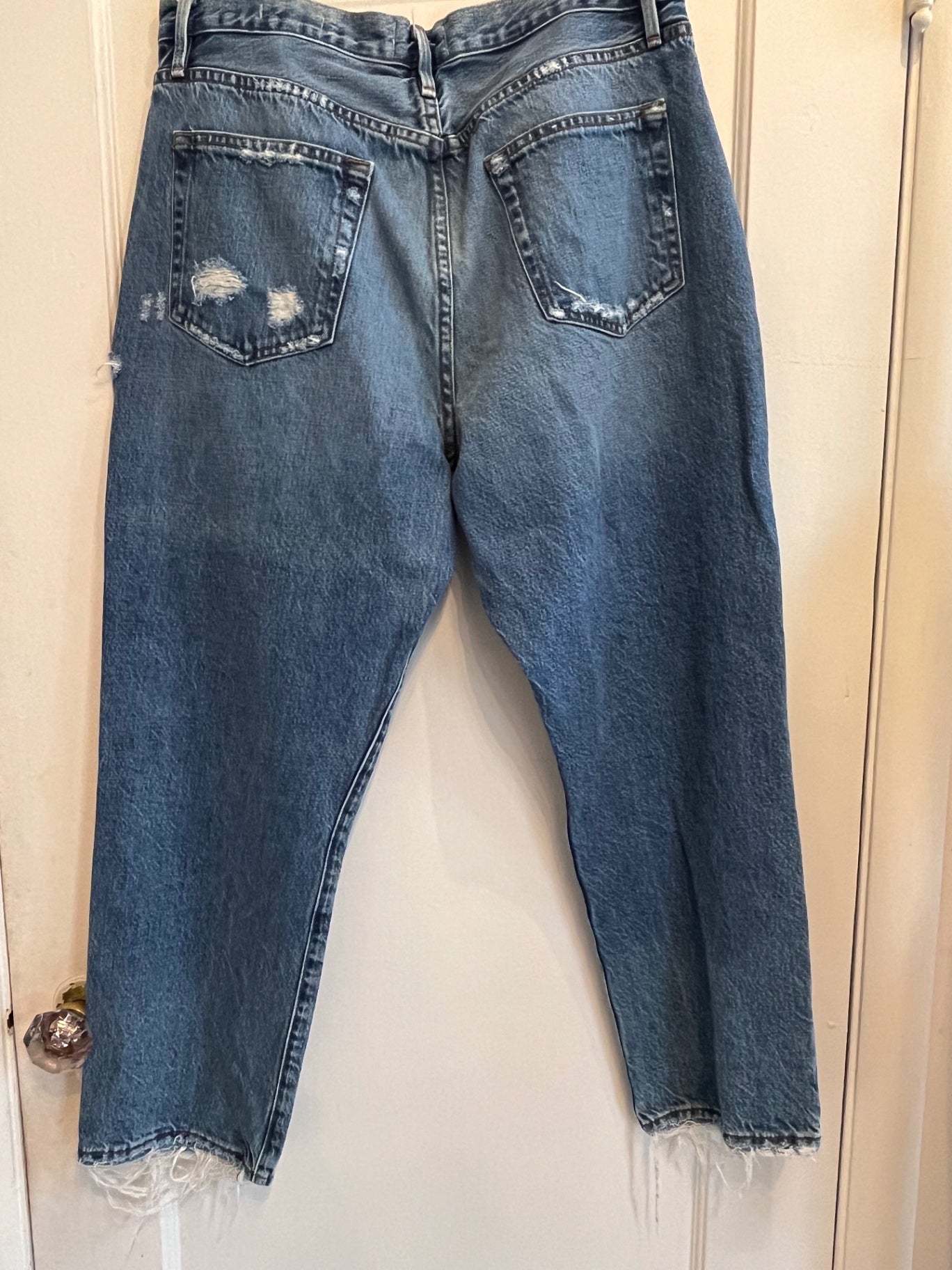 FRAME distressed blue jeans with a relaxed fit with ripped details