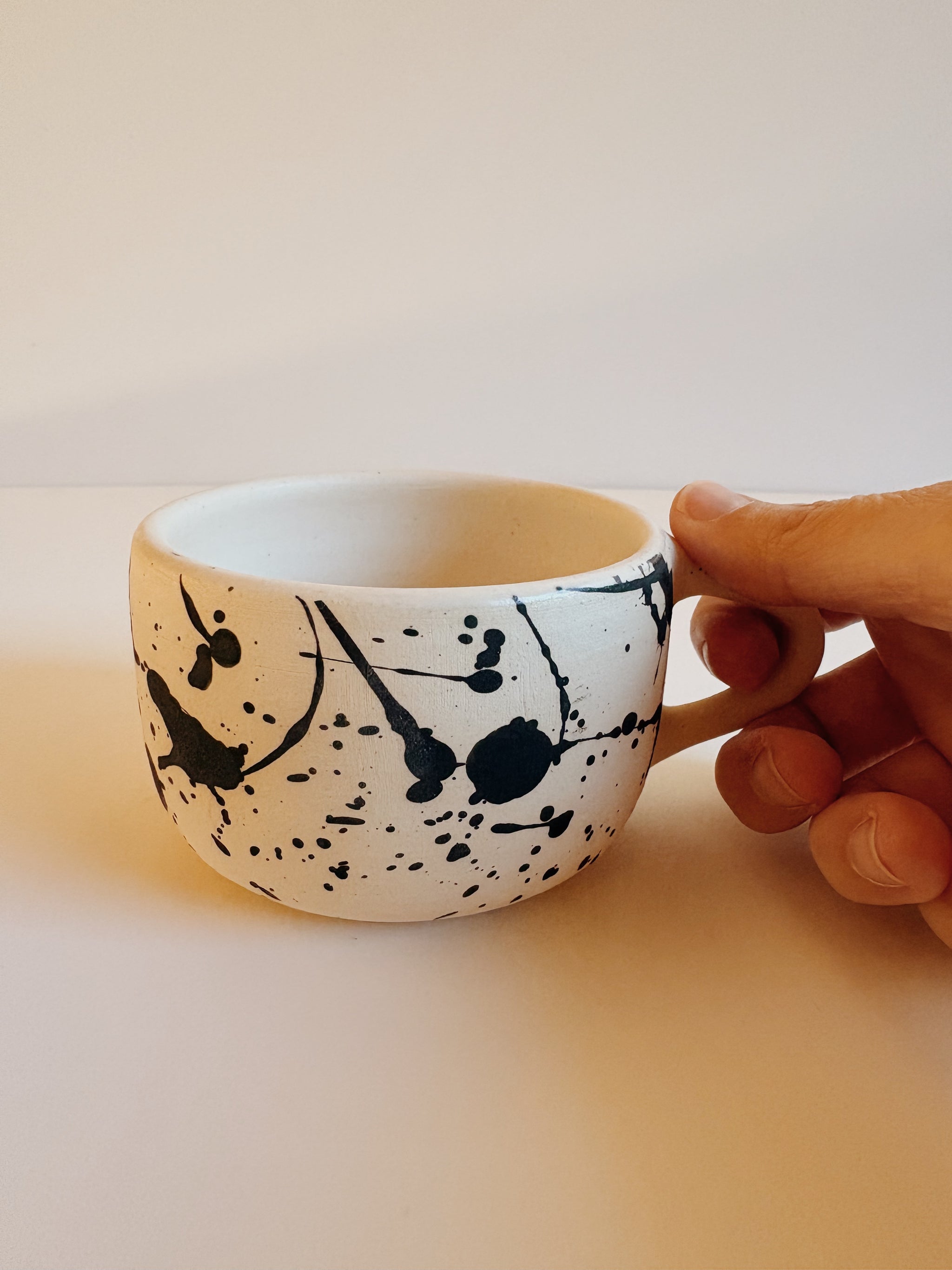A splattered black and white mug made by Berkeley-based ceramicist Libby Hruska of LH Ceramics.