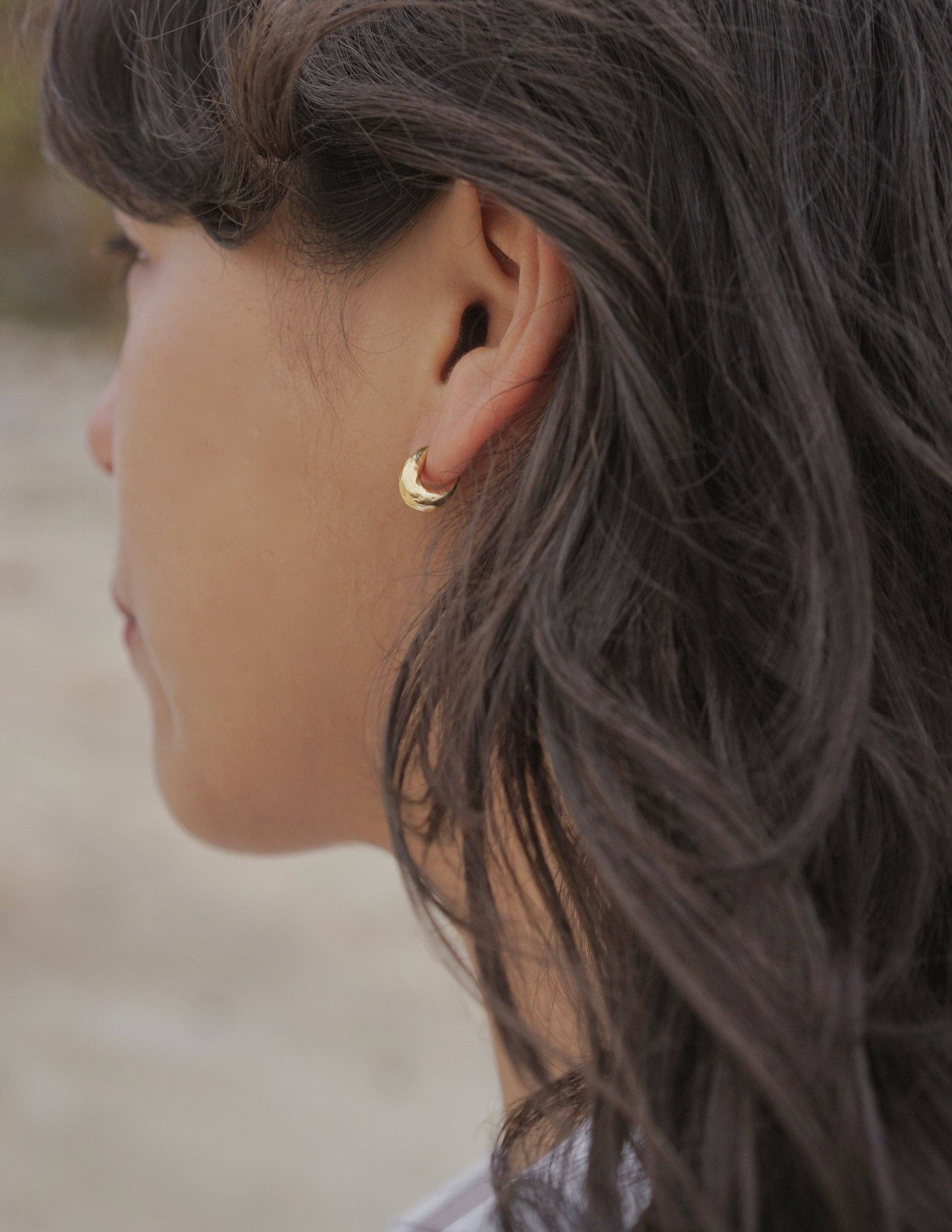 Solid cast hoop earrings with an organic rough textured surface. A nice simple minimal statement earring or for additional piercings layered with other styles. Options: *Gold Vermeil (14k gold over sterling silver) Details: * 12 mm length, 3.9 grams * Made with recycled metals * Sold as a pair * Made in the USA